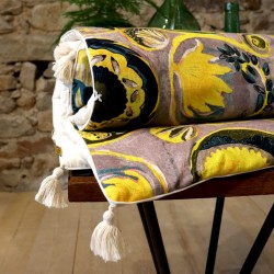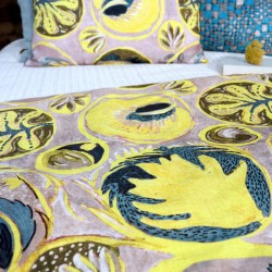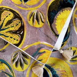 Ce tissu fait partie d’un univers faisant référence à l’exotisme, thème cher à la créatrice. Ce motif végétal et floral s’inscrit dans une composition géométrique moderne. On peut entendre percer au travers de la toile, les percussions brésiliennes auxquelles il fait référence.