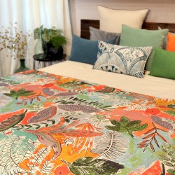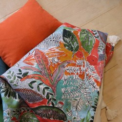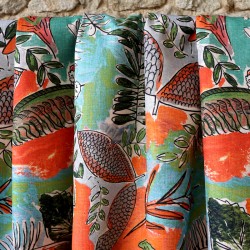 Ce tissu fait partie d’un univers faisant référence à l’exotisme, thème cher à la créatrice. Cet imprimé est une évocation végétale dans une palette aux couleurs vitaminées.