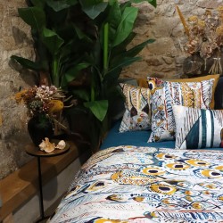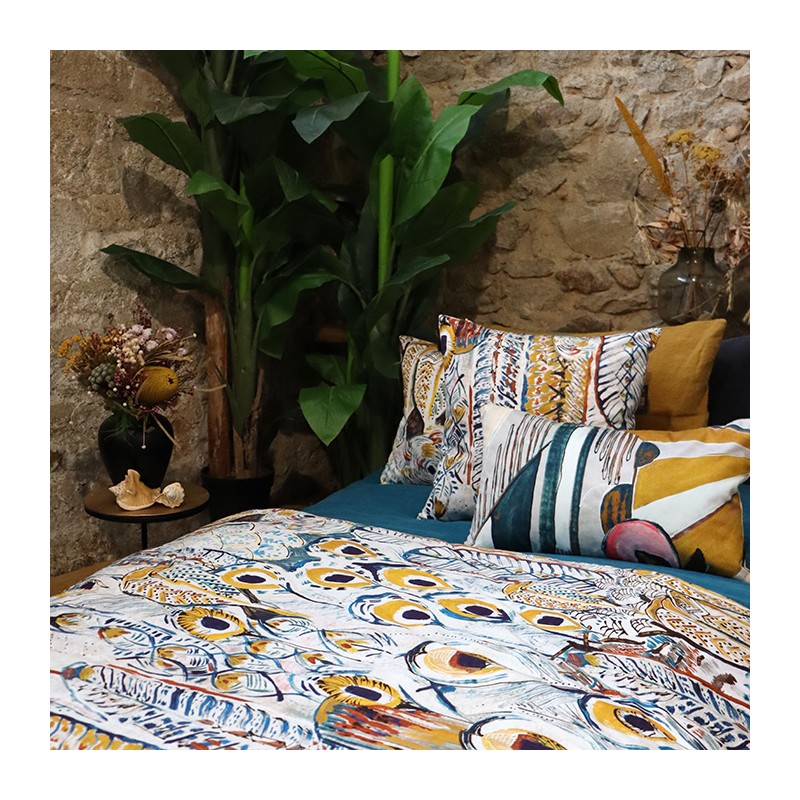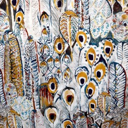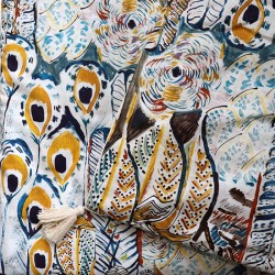 Dessins de plumes quasi à la plume, le tissus panache, bouquet de plumes flottantes décoratives s’inspire des coiffes apaches. Thème ethnique que la créatrice aime revisiter.