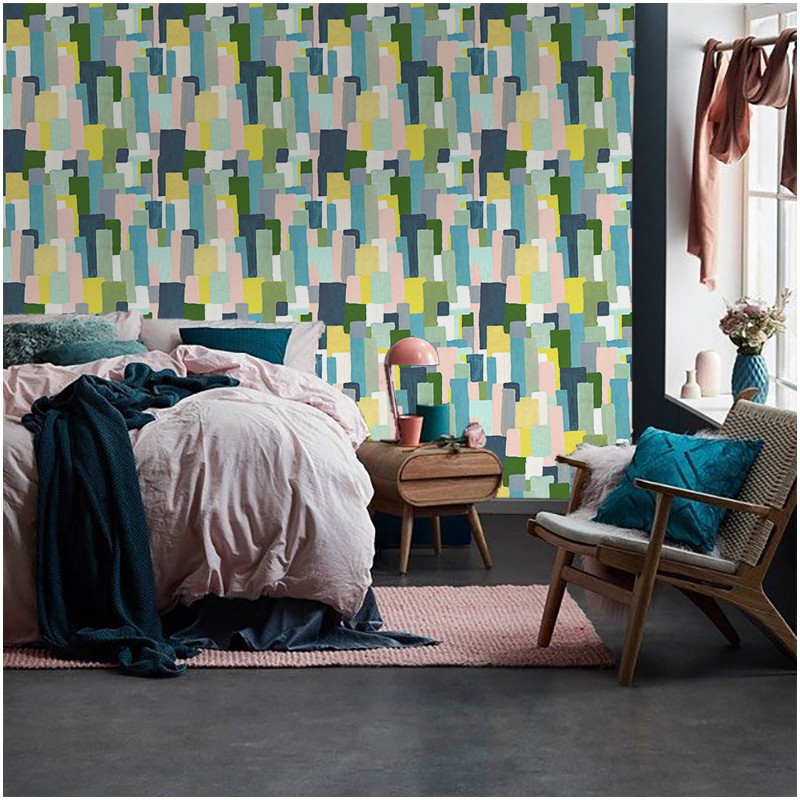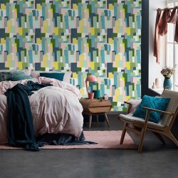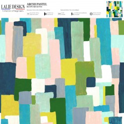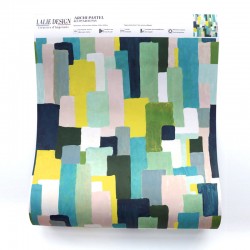 La couleur, merveilleusement dosée et assemblée par la créatrice, révèle un motif où semble s’élever les buildings multicolores d’une ville imaginaire.