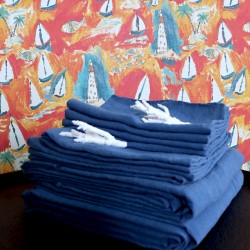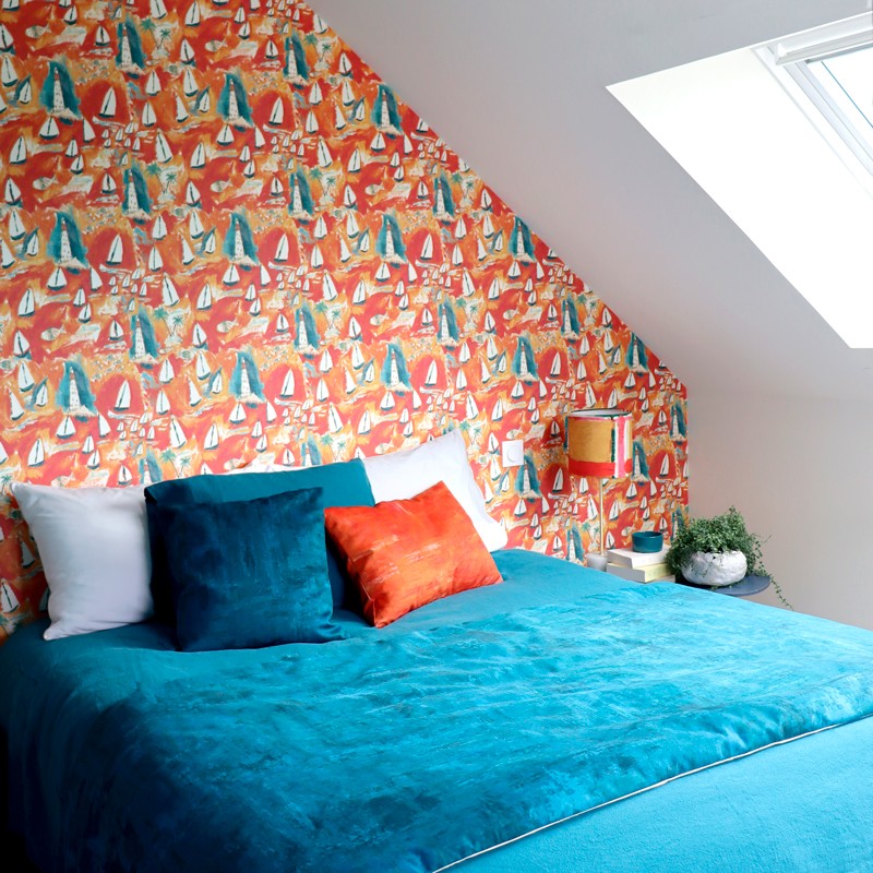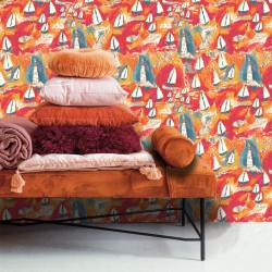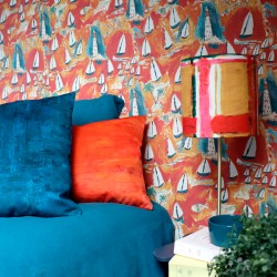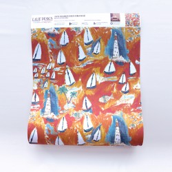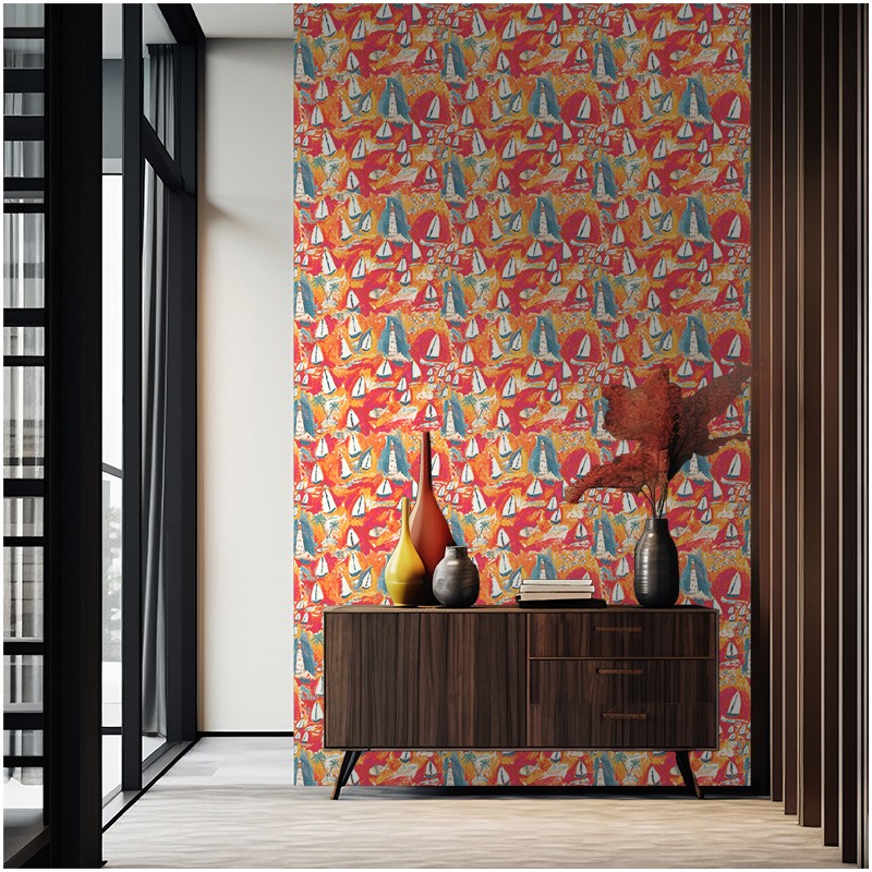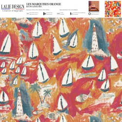 Ici, les thèmes de la mer et du voyage sont interprétés au travers de voiliers et de phares peints de manière stylisée.