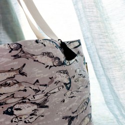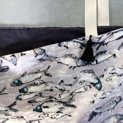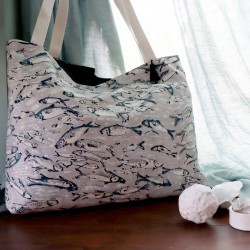 C’est au fil d’une promenade le long de la plage d’Etel que la créatrice a imaginé ce motif. Un frétillant banc de sardines se balade à ses côtés.