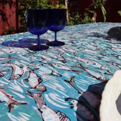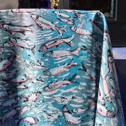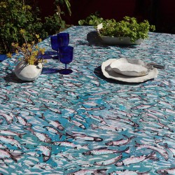 C’est au fil d’une promenade le long de la plage d’Etel que la créatrice a imaginé ce motif. Un frétillant banc de sardines se balade à ses côtés.