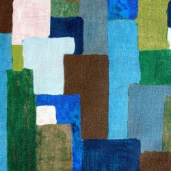 La couleur, merveilleusement dosée et assemblée par la créatrice, révèle un motif où semble s’élever les buildings multicolores d’une ville imaginaire.