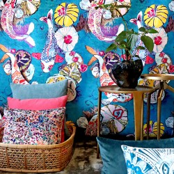 Très emblématiques, les carpes Koï japonaises, ici dessinées par la créatrice Marie-Adeline Riche, nous offrent un véritable tableau transposé sur du velours.