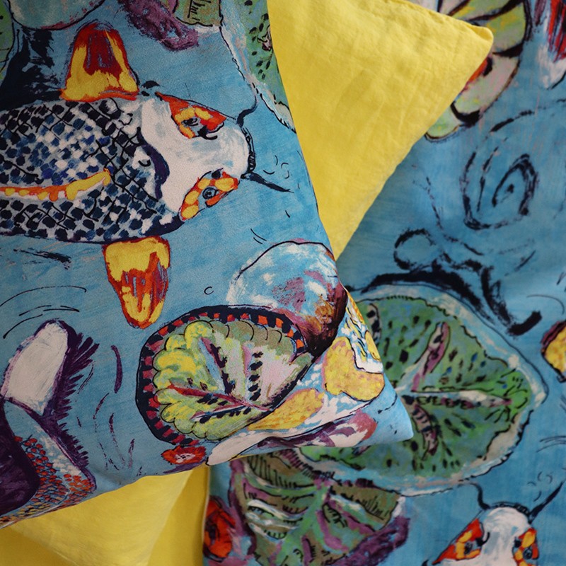 Très emblématiques, les carpes Koï japonaises, ici dessinées par la créatrice Marie-Adeline Riche, nous offrent un véritable tableau transposé sur du velours.