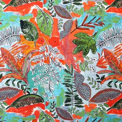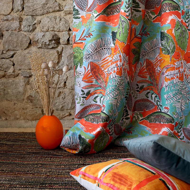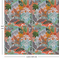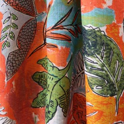 Ce tissu fait partie d’un univers faisant référence à l’exotisme, thème cher à la créatrice. Cet imprimé est une évocation végétale dans une palette aux couleurs vitaminées.