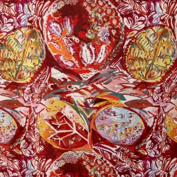 Un dessin extravagant de la créatrice qui vient une nouvelle fois défier notre imaginaire. Rondeur, expressionnisme, chaos et savant mélange de couleurs viennent former une composition musicale et rythmique digne d’une symphonie, avec le thème floral toujours présent.