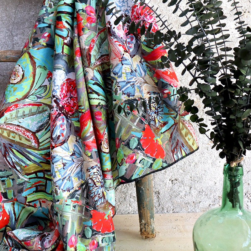 Cet imprimé au motif exotique, coloré et abstrait nous fait danser au rythme des percussions. Le tissu Tam Tam nous invite au voyage.
